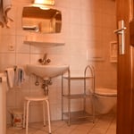 in den geräumigen Bädern befindet sich eine Dusche, WC, Waschbecken, ein kleines Regal, Föhn